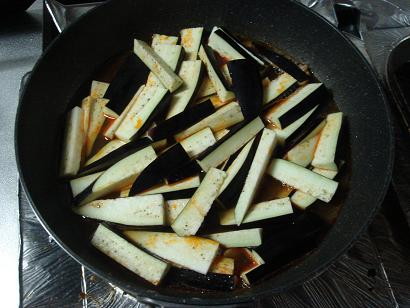 4.フライパンに麻婆豆腐の素を入れて、裏面の作り方を参考に水を入れナスも入れて煮ます。