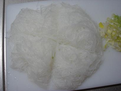 3.春雨をザルにあげて水をきって、食べ易い長さに切ります。