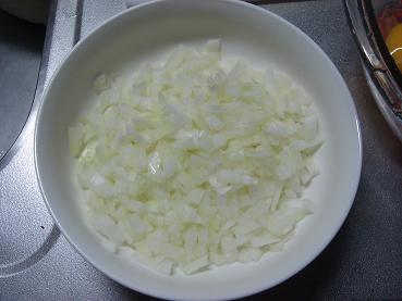 2.玉ねぎをみじん切りにして、ラップを掛けてレンジで1分加熱します。