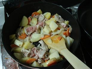 その後、一口大に切った、鶏肉、ニンジン、ジャガイモを加え、