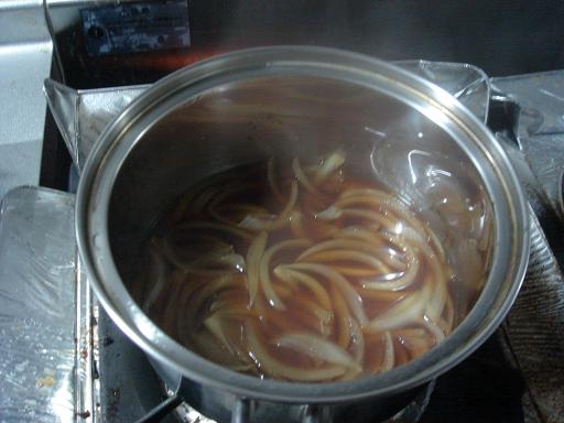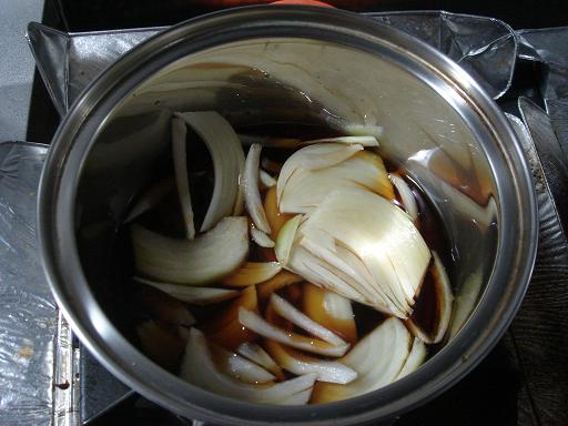 2.小さめの鍋に、すき焼きのたれと水、玉ねぎを入れて、煮ます。