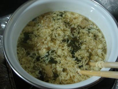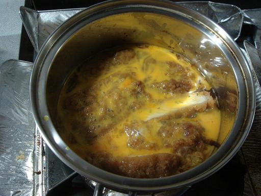 4.カツにも煮汁が染みて、いい色になってきたら、溶いた卵を全体にかけます。