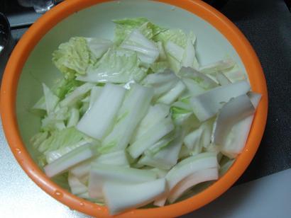 1.白菜を、「葉」の部分と「芯」とに分けて、葉はブツ切り、