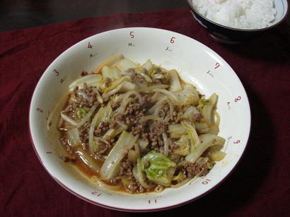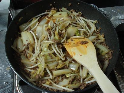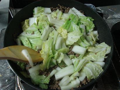 肉の色が変わったら白菜も芯→葉の順番に入れて炒めます。