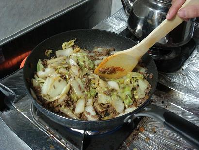 3.白菜がしんなりしたら、豆板醤と味噌を入れて混ぜます。
