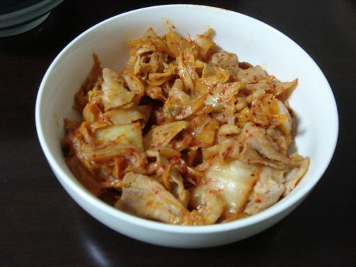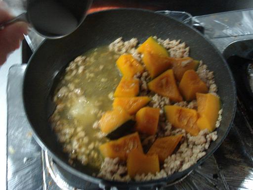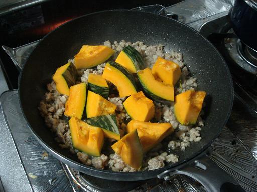5.いったん蓋をしたら、もう一つフライパンを出して、肉を炒めます。